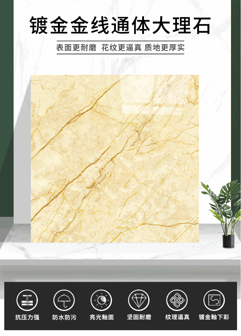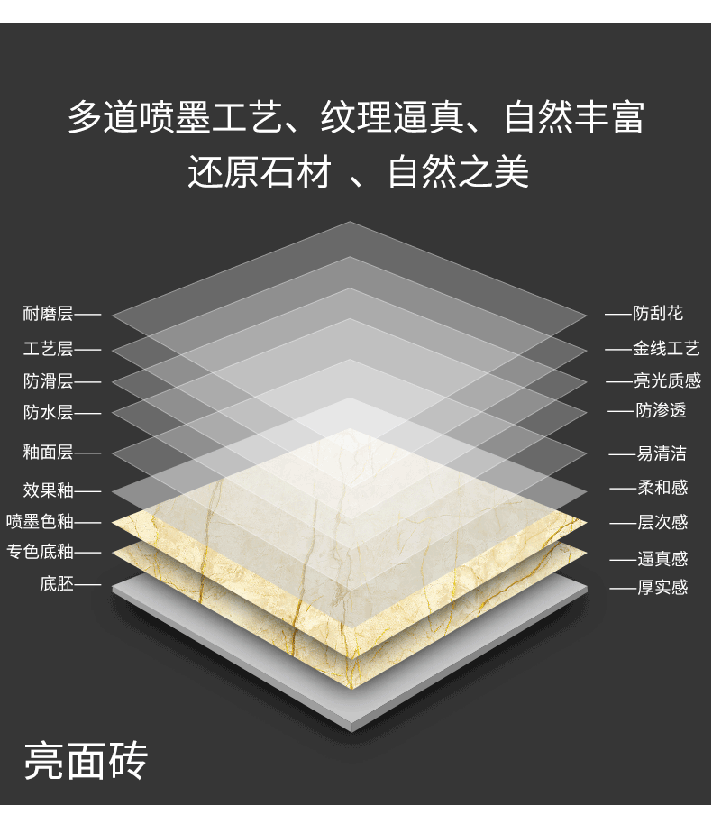 金線金粉 【產(chǎn)品介紹】航天級激光鍍金工藝,鉆石雕刻技術(shù),高溫慢燒,釉層不吸污吸水率低,真空鍍金燒成后再進行真空電鍍工藝,平整如鏡面,精拋細磨,磚面平整光滑細膩光澤度、亮度、硬度較高。立體紋理,釉下彩工藝,三次淋釉增加磚面的立體感。