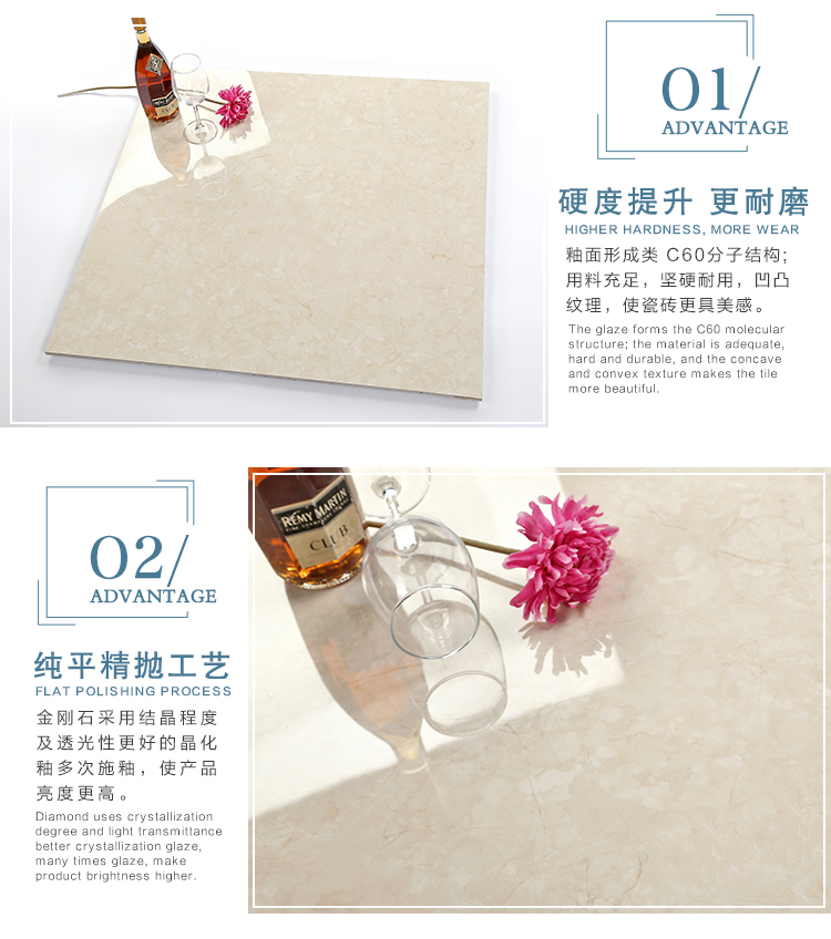 金曼古瓷磚廠家特價金剛石因高品質而得名,是一款極具天然石材效果和微晶石質感的仿石材瓷磚,它不但在價格、環保、耐用和清潔上極具優勢,在質感、規格、花色、重量等指標上,金剛石都遠遠勝于石材、拋光磚。相比其他種類的產品,它最大的特點可以用“高亮度、高耐磨、高平整、高逼真、高清晰、高環保”。