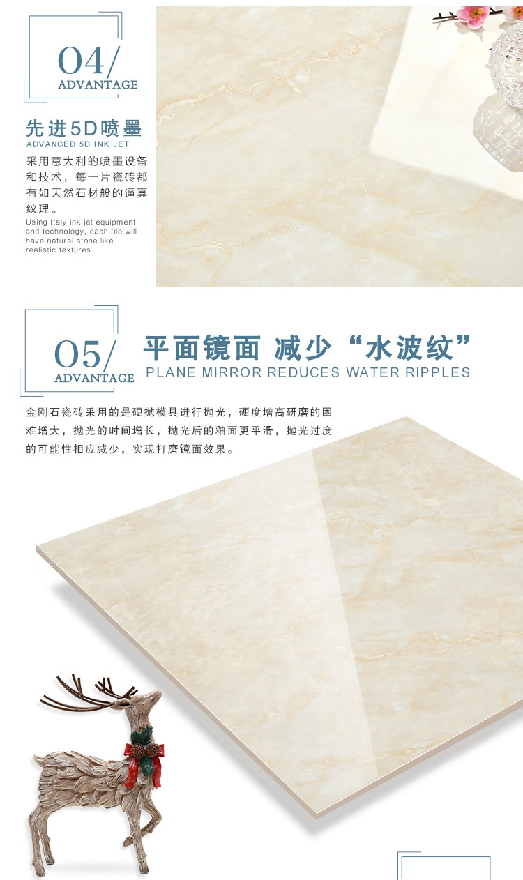 金曼古全拋釉瓷磚運用多層特殊制造工藝,將全透析釉料下彩技術(shù)結(jié)合先進印刷工藝,令花紋俯在下層,低碳能源、清潔生產(chǎn),表面光潔剔透,獨有釉料精拋工序,集拋光磚與仿古磚優(yōu)點于一體,釉面如拋光磚般光滑亮潔,同時其釉面花色如仿古磚般圖案豐富,色彩厚重或絢麗。
