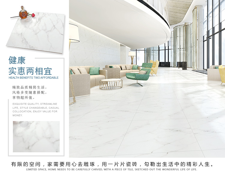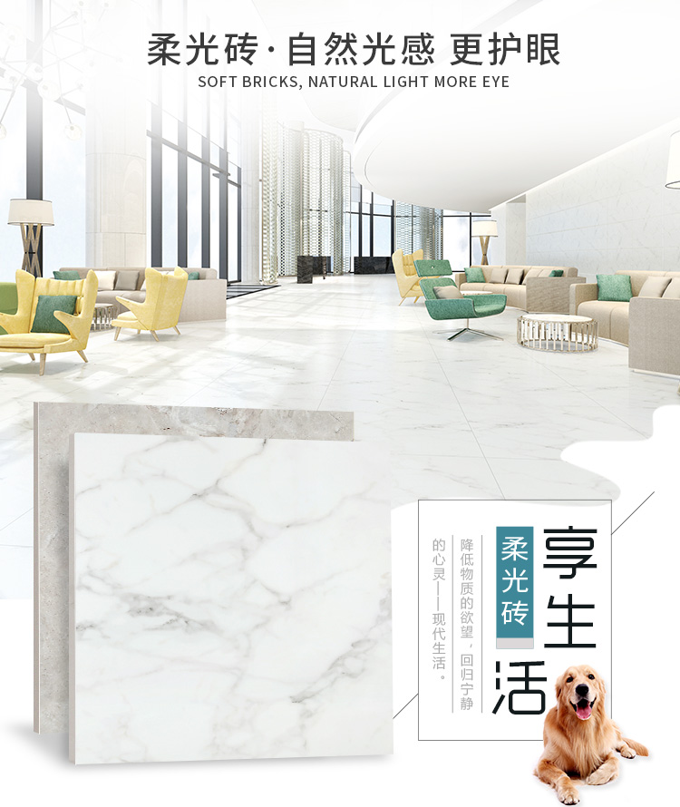 柔光瓷磚是磚面反射介于強(qiáng)光與弱光之間的一類瓷磚,其結(jié)合亮光類瓷磚的高調(diào)明艷裝飾和啞光類瓷磚的低調(diào)內(nèi)斂搭配效果,通過動態(tài)柔光蠟拋技術(shù),降低產(chǎn)品反光率,從而達(dá)到人體舒適的視覺感受以及無光污染的空間裝飾效果。優(yōu)點(diǎn):1.視覺舒適,無光污染 2.堅(jiān)固耐磨,不易刮花.